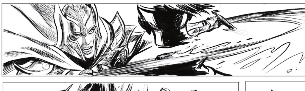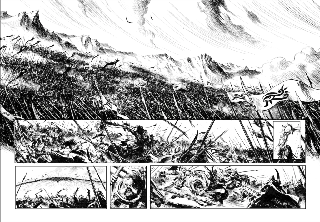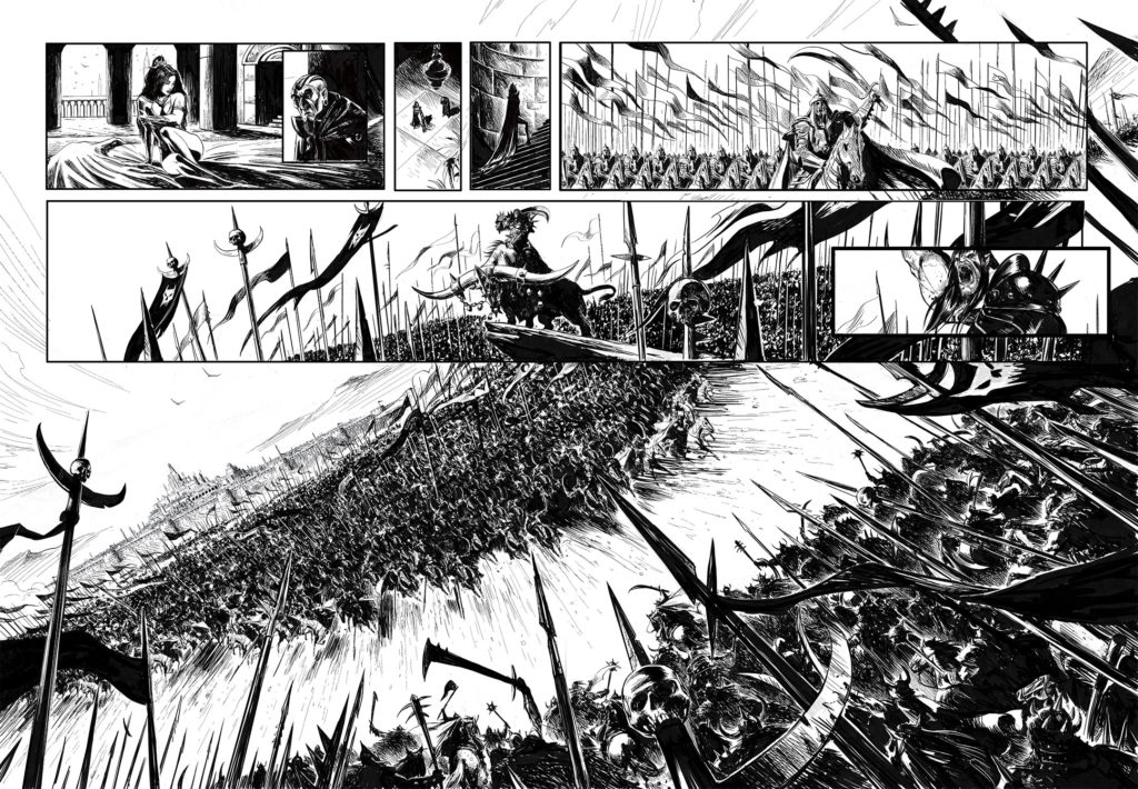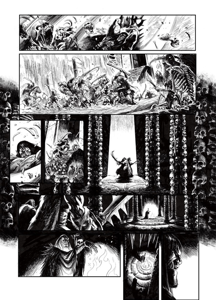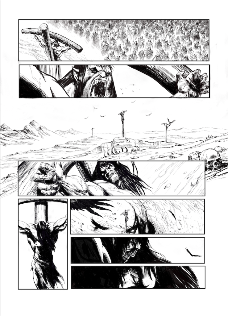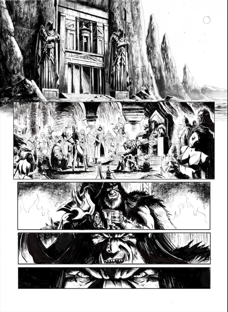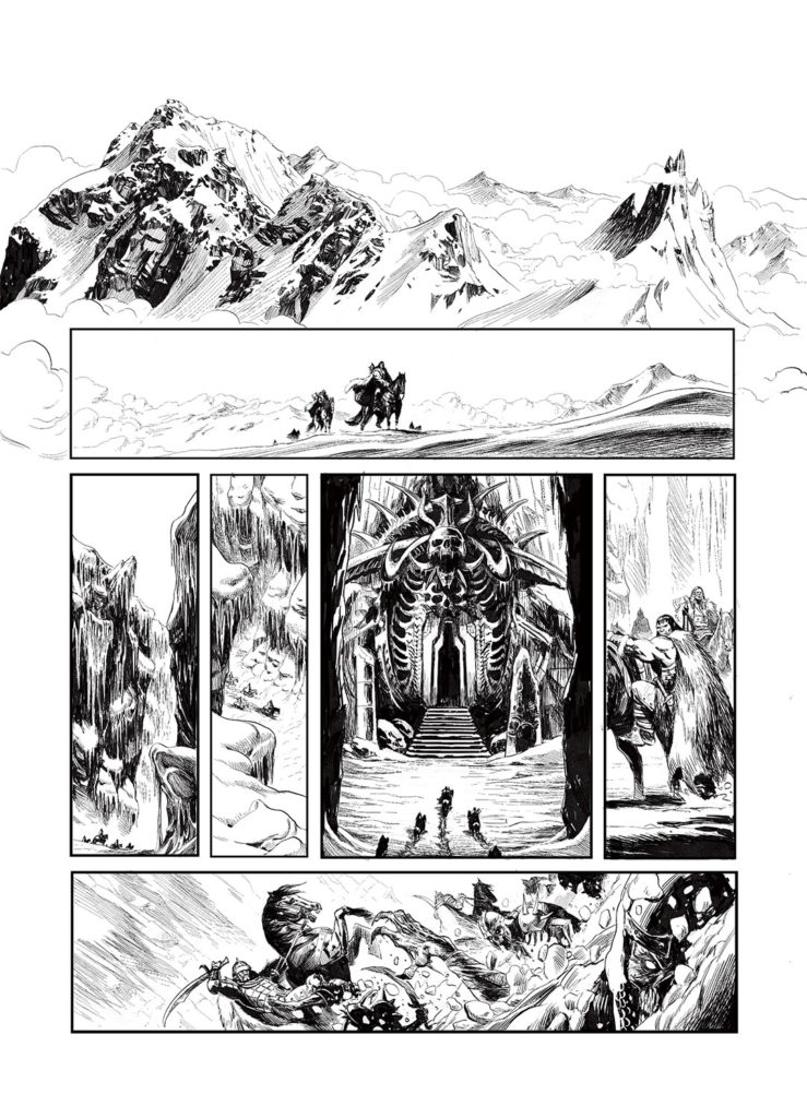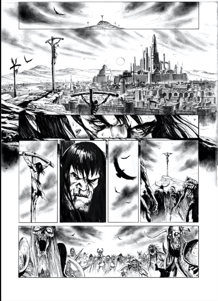 En 2021, je mettais pour la première fois les pieds sur les terres d’Arran/ Mondes d’Aquilon, sous l’impulsion de l’ami Jean Luc Istin qui me proposa de travailler sur une adaptation libre de la nouvelle « Une Sorcière Viendra au Monde », de Robert E Howard mettant en scène ce bon vieux Conan le Barbare… mais dans une version Orc, avec tout ce que cela implique de supplément en bourrinage jubilatoire. Dire que l’aventure fut un régal tiendrait de l’euphémisme, tant il est vrai que je rêvais de mettre en scène le célèbre barbare… Encore un grand merci à Jean Luc et aux éditions Soleil pour m’avoir permis de réaliser cet album qui marqua un jalon pour le moins important dans ma carrière.